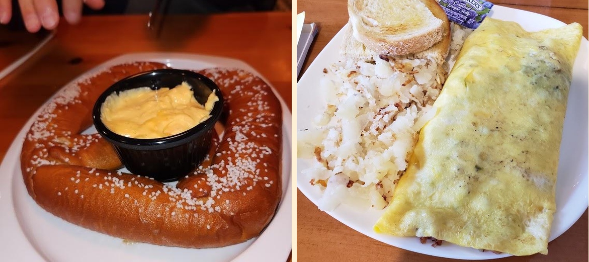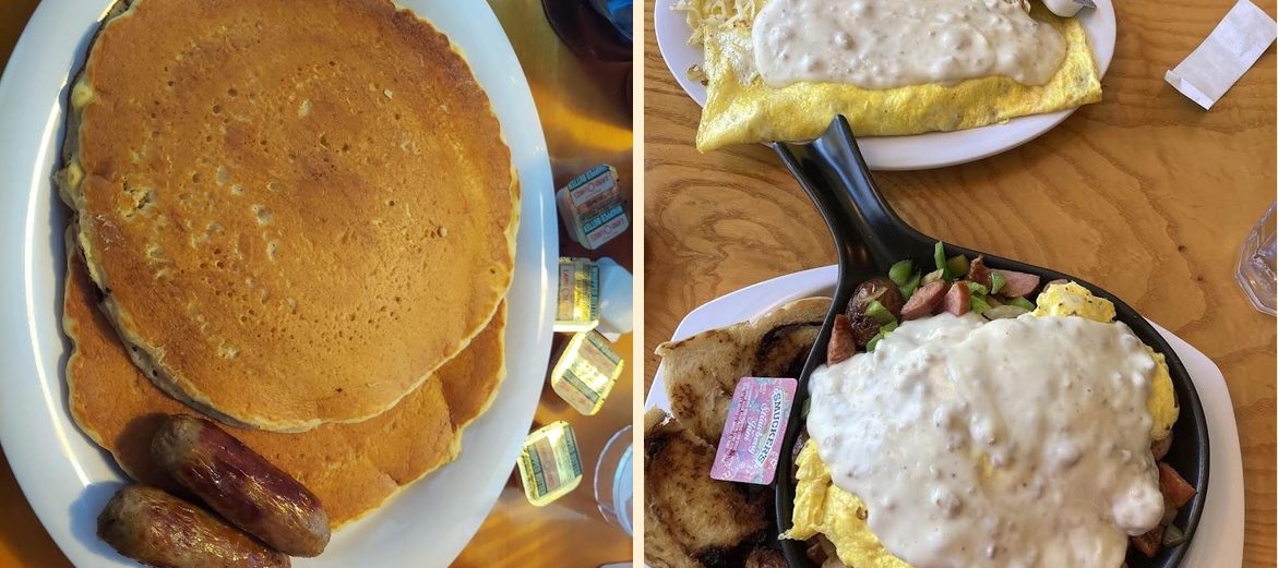 The breakfast menu features favorites like pancakes with bacon, French toast, and a variety of omelets. The homemade cinnamon rolls are a must-try.