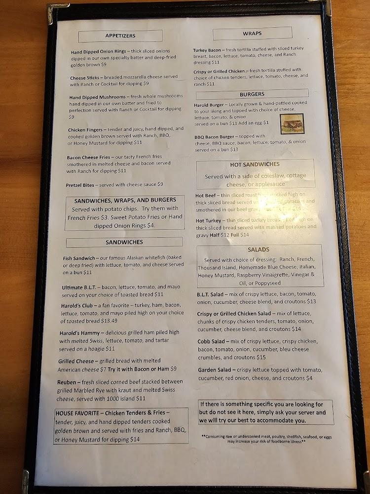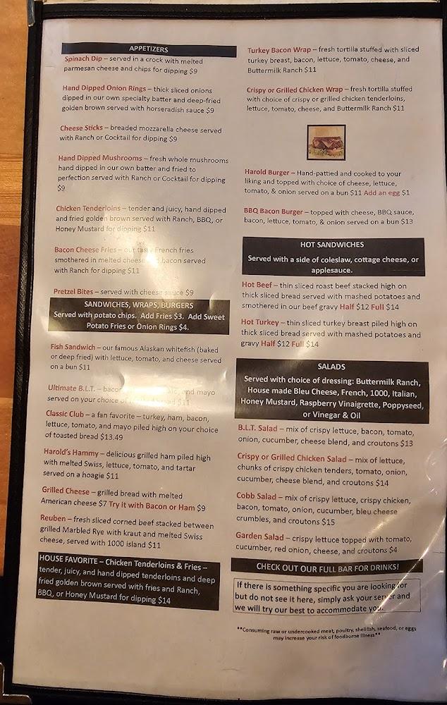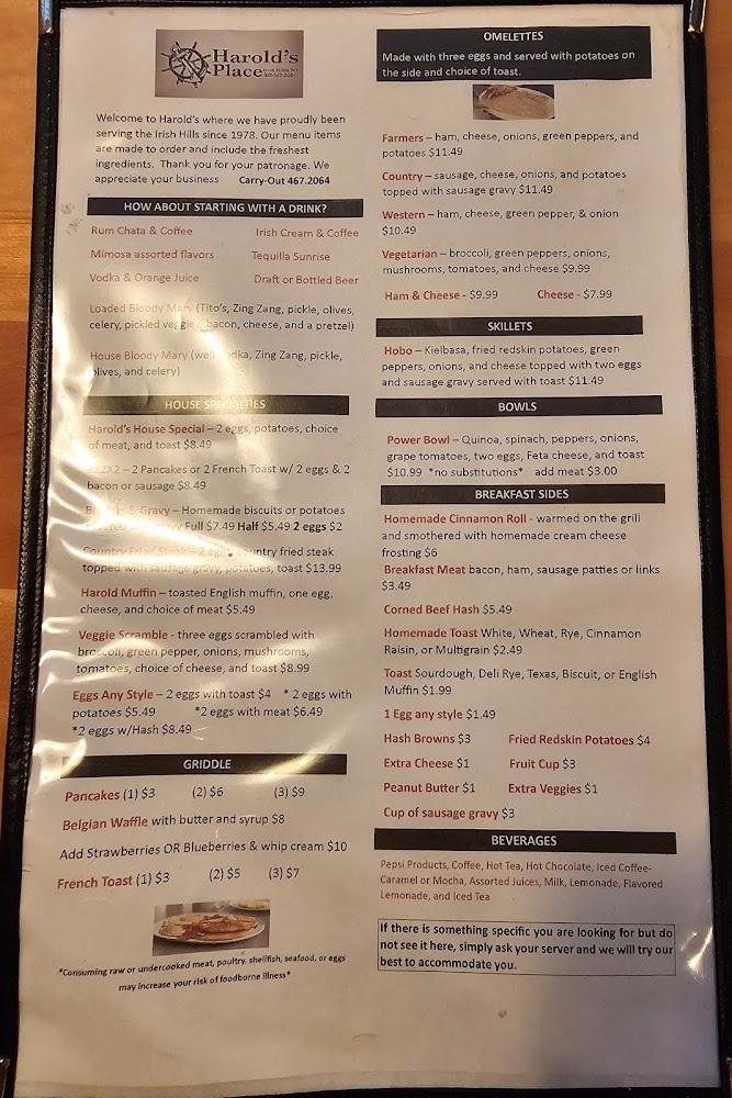 Welcome to Harold's Place, your cozy family-owned restaurant in Brooklyn, MI, serving delicious home-cooked meals since 1978. Whether you're craving a hearty breakfast, a satisfying lunch, or a fulfilling dinner, we have something for everyone. Indulge in our famous fresh fish, warm homemade breads, and delectable cinnamon rolls. Enjoy a drink from our extensive selection of beer, wine, and specialty cocktails, including our renowned Bloody Marys. With a welcoming terrace, accessible seating, and quick service, we invite you to experience the warmth of family dining at Harold's Place, where great food and good times come together!